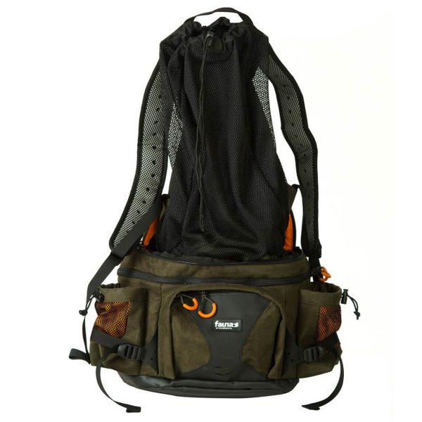 Praktisk hoftebelte som gir støtte i korsryggen og med plass til det man behøver til på korte jakt/dagsturer. Integrert i vesken ligger et viltnett med bæreremmer, som kan tas ut slik at hoftebeltet kan brukes til dagsturer. Fauna F 12 Hip er produsert i det lydløse og vanntette Fauna-stoffet SL450:3 med solide spenner og YKK-glidelåser.