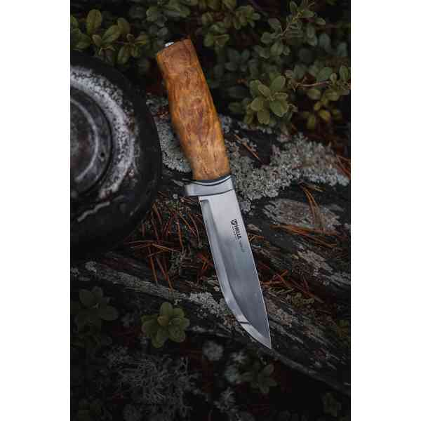 Kniven leveres med slire i ekte brunt lær med trykknapp som holder den sikkert på plass. Venstrehendt slire er tilgjengelig – oppgi dette i kommentarfeltet ved bestilling.